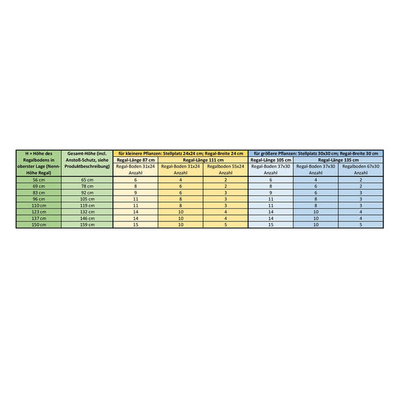Le nombre d'étagères incluses est conçu pour offrir des hauteurs d'étagères correspondant aux hauteurs habituelles des plantes généralement placées sur des étagères – voir tableau dans la galerie (dernière image).