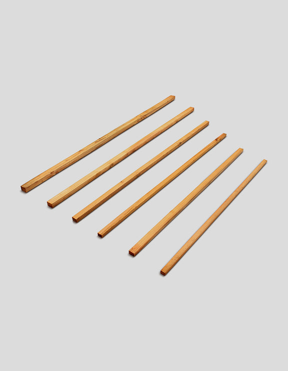 Les lattes sont sciées droites sur toutes leurs faces. Elles conservent leur aspect brut de sciage. Le bois présente des irrégularités naturelles, notamment des nœuds.
