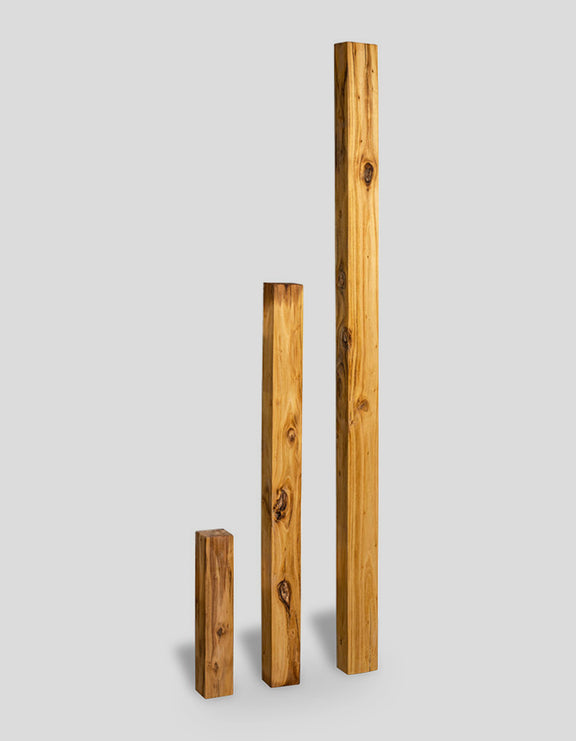 Les palissades rectangulaires sont sciées sur leurs quatre faces, ce qui leur confère un aspect brut. Le tronc d'origine, notamment les branches enchâssées, présente un réseau de fibres visible dans le bois. Les extrémités des stèles sont chanfreinées.