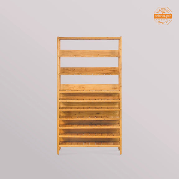 Le porte-serviettes en bois vous offre différentes options concernant la hauteur des étagères – voir les photos dans la galerie. Il y a un espace de 12 cm entre l'étagère inférieure et le sol. Les étagères ont une épaisseur de 3 cm. Elles peuvent être espacées de 6,4 cm, ce qui permet d'ajuster leur hauteur selon vos besoins. Hauteurs possibles (espace entre les étagères) : 9,8 cm / 16,2 cm / 22,6 cm / 29 cm / 35,4 cm / 41,8 cm, etc.