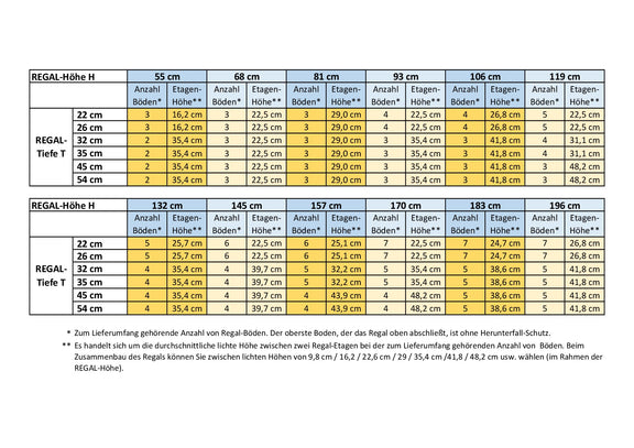 Le nombre d'étagères incluses dans la livraison est calculé de manière à ce que, grâce à une disposition relativement uniforme, la hauteur des étagères corresponde au mieux à leur profondeur. Dans certains cas, elle peut être légèrement supérieure, dans d'autres légèrement inférieure. Ce choix repose sur le principe que les étagères les plus profondes sont destinées aux objets plus volumineux, qui nécessitent généralement une plus grande hauteur. Vous recevrez donc suffisamment d'étagères, sans surplus. Veuillez consulter le tableau de la galerie (dernière image) pour connaître le nombre d'étagères incluses et la hauteur moyenne correspondante, en fonction de la hauteur et de la profondeur des étagères.