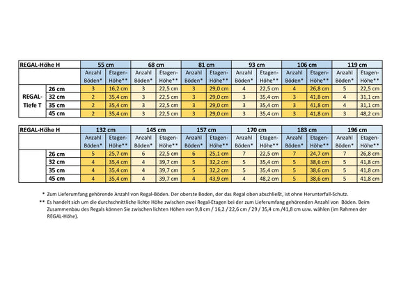 Le nombre d'étagères incluses est choisi de manière à ce que, dans une configuration globalement uniforme, la hauteur des étagères corresponde au mieux à leur profondeur. Dans certains cas, elle est légèrement supérieure, dans d'autres légèrement inférieure. Ce choix repose sur le principe que les étagères plus profondes sont destinées aux livres plus volumineux, qui nécessitent généralement une plus grande hauteur. Vous recevrez donc suffisamment d'étagères, sans surplus. Veuillez consulter le tableau de la galerie (dernière image) pour connaître le nombre d'étagères incluses et la hauteur moyenne obtenue, en fonction de la hauteur et de la profondeur des étagères.