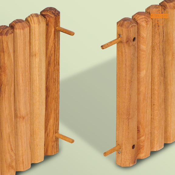 Installation : Pour installer la bordure de pelouse en bois , creusez une tranchée peu profonde, dont la profondeur dépend de la profondeur d’enfouissement souhaitée. Une fois la tranchée creusée, assemblez la bordure à l’endroit voulu ; les sections sont reliées par des chevilles en bois de robinier. Fixez-la verticalement et latéralement avec un peu de terre. Remplissez ensuite la tranchée progressivement des deux côtés, en tassant la terre au fur et à mesure, puis tassez-la fermement des deux côtés.