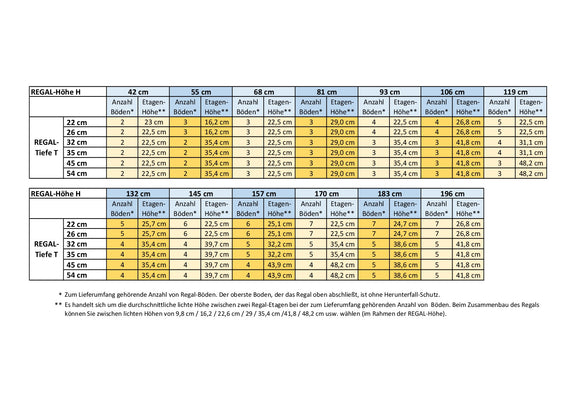 Le nombre d'étagères incluses dans la livraison est calculé de manière à ce que, grâce à une disposition relativement uniforme, la hauteur des étagères corresponde au mieux à leur profondeur. Dans certains cas, elle peut être légèrement supérieure, dans d'autres légèrement inférieure. Ce choix repose sur le principe que les étagères les plus profondes sont destinées aux objets plus volumineux, qui nécessitent généralement une plus grande hauteur. Vous recevrez donc suffisamment d'étagères, sans surplus. Veuillez consulter le tableau de la galerie (dernière image) pour connaître le nombre d'étagères incluses et la hauteur moyenne correspondante, en fonction de la hauteur et de la profondeur des étagères.