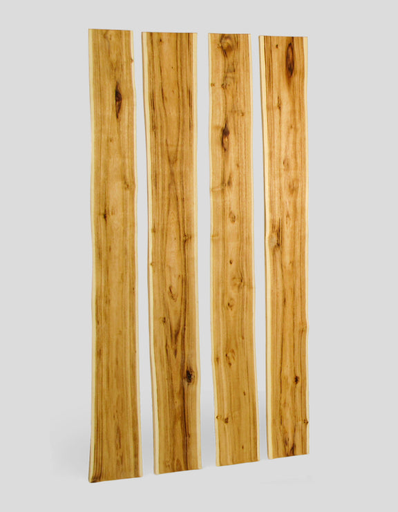 Les planches sont sciées à partir de grumes droites et conservent leur surface brute. N'étant pas équarries, elles gardent la forme naturelle de la grume. Les faces étroites sont écorcées et débarrassées de leurs libers, puis aplanies. Elles restent cependant brutes. La largeur des planches variant naturellement, une gamme de dimensions est proposée. Le réseau de croissance de la grume, y compris les branches incluses, est visible sur la planche.